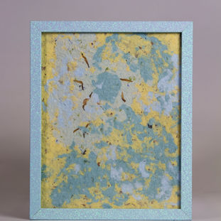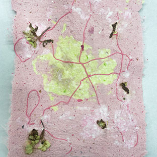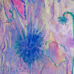 Acrylic paint, molding paste, tracing paper glitter glue, foam, flowers on wood panel